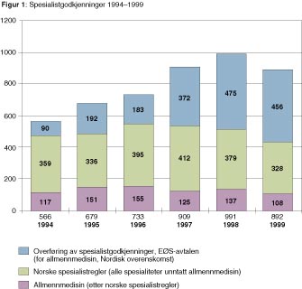 Det store antall konverterte spesialistgodkjenninger i 1999 er ikke ensbetydende med nye leger til Norge. Importen av utenlandske leger er for tiden ca. 250 per år. Sammenliknet med 1998 har det totale antallet konverterte spesialistgodkjenninger sunket med 19.