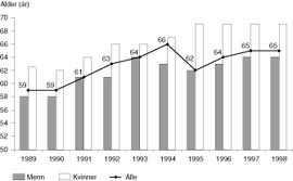 Pasientenes alder har økt jevnt i løpet av tiårsperioden, både for menn og kvinner (fig 1). Median alder på operasjonstidspunktet gikk opp fra 58 år til 64 år for menn og fra 62,5 år til 69 år for kvinner. Andelen kvinner har steget fra 12,8 % i 1989 til 19,8 % i 1998 (fig 2). På samme måte har andelen av pasienter med økt operasjonsrisiko (tab 2) vært jevnt stigende, fra 23,7 % til 61,8 % i samme tidsrom (fig 3).