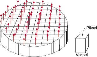 Digitale bilder består av små bildeelementer, piksler, der hver piksel svarer til et lite volumelement, voksel, i den avbildede vevsskiven (fig 7). Hver voksel har sin egen vevsmagnetisme, vokselmagnetisme, og alle vokselmagnetismene induserer samtidig hvert sitt separate signal (vokselsignal) i mottakerspolen. For å kunne omdanne disse signalene til et bilde, må hvert vokselsignal gis en bestemt kode som definerer plasseringen i skiven. Denne koden er kombinasjonen av frekvens og fase. Alle strømsignaler kan defineres med en bestemt styrke, frekvens og fase. Styrken til vokselsignalet bestemmer gråtonen i motsvarende piksel. Bestemte faseforskjeller og frekvensforskjeller innen vevsskiven kan oppnås ved å applisere kortvarige gradienter i vevsskivens plan, dels før, dels under selve registreringen av det induserte strømsignalet. Det induserte strømsignalet fra hele vevsskiven vil derved inneholde multiple frekvenser og faser, men signalet kan dekomponeres i sine enkelte frekvenser og faser ved hjelp av en såkalt Fourier-transformasjon (3, 4). Derved er grunnlaget lagt for rekonstruksjon av todimensjonale bilder.