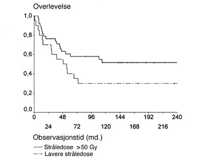 Pasienter behandlet for medulloblastom/ primitiv nevroepitelial tumor (n = 58) hadde 45 % beregnet 20 års total overlevelse etter operasjon og kraniospinal strålebehandling. 20-årsoverlevelsen øker til 51,5 % når pasienter som fikk stråledoser mot tumorområdet lavere enn 50 Gy (n = 20), ekskluderes fra overlevelsesanalysen (fig 2). Medulloblastompasienter behandlet med stråledoser under 50 Gy hadde en tendens til dårligere prognose (30 % langtidsoverlevelse), men forskjellen var ikke statistisk signifikant (p> 0,10 ved logranktest). Risikoen for residiv var størst de første fem årene etter diagnosetidspunktet, enkelte pasienter fikk sene residiver 8 – 9 år etter primærbehandlingen. Men alle pasienter som var residivfrie etter ti år, var helbredet for sin sykdom.
