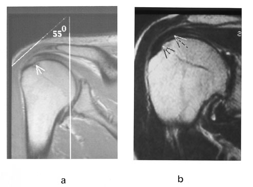 I opererte menisker kan det ved MR uten artrografiteknikk være vanskelig å avgjøre om det foreligger en reruptur. Hvis det er et høysignalområde som går mot reseksjonsranden, er det umulig å avgjøre om det er reruptur eller arrvev (6). Figur 5 viser skjematisk hvordan det kan se ut. MR-artrografi med direkte instillasjon av fortynnet gadolinium med påfølgende manipulasjon av kneleddet vil gjøre diagnostiseringen lettere. Dersom høysignalet blir like høyt som kontrastvæsken, må det være en kommunikasjon forenlig med ruptur. Dersom signalet er lavere enn kontrastvæsken, foreligger det kun arrvev (fig 6).