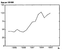 Figur 2 viser aldersjusterte insidensrater av kreft i livmorhalsen fra 1965 til 1997. Det var en meget svak økning frem til 1975, hvoretter man fikk en tiårsperiode med rundt 30 % fall i insidensraten. Fra 1983 – 84 har insidensraten vært omtrent konstant, til tross for at stadig flere premaligne tilstander er blitt diagnostisert. Dette er vesentlig forskjellig fra hva man har observert i de andre nordiske land (3). Umiddelbart vil man tro at det skal være en forsinkelse i tid mellom en økning av insidensraten for premaligne tilstander og et fall i insidensraten for maligne tilstander, men dette er ikke kommentert i Läärä og medarbeideres artikkel eller i Sigurdsons artikkel (1, 3). Mortalitetsraten har holdt seg konstant de siste 20 år (4).