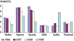 Antall turister som hvert år søker legebehandling i forhold til hvor mange som reiser til det enkelte land, fremgår av figur 1. For Thailands og USAs vedkommende er antall reisende helt korrekt. For de andre landene vil det være reisende som ikke er registrert. Vårt materiale viser at reiser til Kypros fører til dobbelt så mange legebesøk som reiser til nabolandet Hellas. Spania har hatt en reduksjon i andelen reisende som søker lege på 39 % fra 1996 til 1999. Den generelle nedgang i 1999 i forhold til tidligere år kan skyldes at ikke alle sykdomstilfeller er registrert.