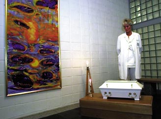 For snart 20 år siden fikk hun sin førstefødte, men den lille piken var død. Eva så nesten ikke sitt døde barn før det ble lagt til side. Ingen spurte henne hva hun ville, og selv hadde hun verken krefter eller sinnsro til å tenke eller si noe om det. Hjemme fattet Eva at omgivelsene nokså snart var ferdig med den dødfødte, og at det ikke var særlig passende at hun fortsatte å snakke om sin sorg. Opp gjennom årene har hver fødselsdag vært som et åpent sår. ”Nå skulle hun ha begynt på skolen. Nå skulle hun vært konfirmant.” De psykiske og psykosomatiske plagene har vært mange, tilhørende lege- og terapeutbesøk til måtelig nytte. Etter fødselen ble det visstnok sagt at barnet skulle obduseres, men det ble ikke gjort. Skuffelsen over dette har, etter min bedømmelse, fått låne styrke fra ubearbeidede følelser. Men den førte i hvert fall til samtale med gynekolog og jordmor for et par år siden. Godviljens mennesker, men de hadde naturligvis ingen andre fakta å komme med enn sparsomme journalnotater. Så ble jeg spurt om det var mulig å finne gravstedet. Kirkegårdsprotokollene er selvsagt ikke åpne for allmennheten, men som prest får jeg ”ulovlig” anledning til å lese i dem. Det var enkelt å finne graven til Evas barn, og det er det som regel. Men gravstedets eier vet jo ikke at et dødfødt barn også ble lagt der, og mange har så sterke følelser for gravene at det kunne bli den rene katastrofen om jeg tok med fremmede dit, fremmede som kanskje ville legge på blomster. Derfor tilbyr jeg førsteløsningen: Ubemerket henter jeg litt jord fra gravsted