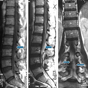 Epiduralrom består hovedsakelig av fettvev og nettverk av vener, som krysses av nerverøtter. Dette byr på liten motstand mht. spredning av infeksjon. Derfor kan epidurale abscesser spre seg over mange segmenter. I tillegg kan de bestå av mye puss og lite granulasjonsvev, og grensen mot normalt vev blir ikke demarkert med MR-kontrast (fig 1). Derfor ble det foreslått at myelografi med CT kan være bedre ved diagnostikk av diffuse abscesser enn MR (23 – 25).