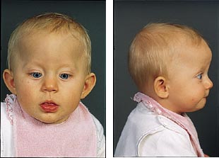 Ved undersøkelsen var pasienten i god allmenntilstand og hadde normal psykomotorisk utvikling. Hodeomkrets var 44,5 cm, svarende til 50-percentilen. Fremre fontanell var åpen med normal fylde. Pannen var tilspisset, med en vollformet oppdriving i midtlinjen, biparietalavstanden var økt og øynene tettsittende (fig 4). Nevrologisk status var normal og annen organstatus uten anmerkninger.