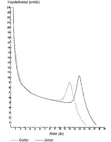Veksthastigheten hos barn er forskjellig på de ulike alderstrinn. Figur 1 viser en typisk hastighetskurve for høydevekst (1). Voksne menn er gjennomsnittlig 13 cm høyere enn kvinner. 8 – 10 cm av denne forskjellen oppstår ved at guttene vokser i to år mer enn jentene før vekstspurten setter inn, og 3 – 5 cm på grunn av guttenes sterkere vekstspurt. I tillegg til kjønnsforskjellen i modningshastighet er det store individuelle forskjeller. Et barns fysiske yteevne vil være avhengig av barnets størrelse og kroppslige modenhet. I idrettskonkurranser vil klasseinndeling etter kronologisk alder favorisere individer som modnes tidlig, og spesielt i pubertetsårene vil dette kunne gi store utslag (2).