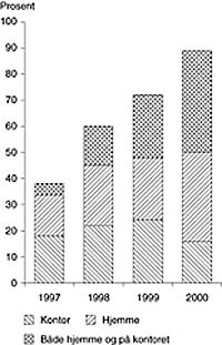 1 181 (90 %) av svarerne angav at de har tilgang til Internett. 214 (16 %) har slik tilgang bare på kontor/arbeidssted, 452 (34 %) bare hjemme/privat, mens 515 (39 %) har Internett-tilgang både hjemme og på arbeidet (fig 1). 136 leger (10 %) svarte at de ikke har Internett-tilgang. Det var ingen sikker forskjell i Internett-tilgang mellom mannlige og kvinnelige leger. Noe færre allmennleger og psykiatere har tilgang til Internett enn andre legegrupper (tab 2). Internett-tilgang er vanligst i aldersgruppen 40 – 44 år, der 95 % av legene har tilgang, og sjeldnest hos leger over 60 år, der 70 % rapporterer slik tilgang. For øvrig var det liten variasjon med alderen.