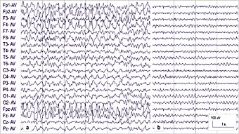 Under telemetrisk video-/EEG-registrering, som ble utført etter innleggelsen, angav pasienten flere langvarige perioder der han merket lette symptomer av samme karakter som nevnt ovenfor. EEG viste anfallsaktivitet i form av rytmiske skarpe potensialer lokalisert frontalt (fig 3a). Ved en anledning ble han behandlet med 600 mg natriumvalproat intravenøst, med etterfølgende infusjon, uten endring i EEG. Etter søvn følte pasienten seg ubesværet og EEG var normalt (fig 3b). Tilstanden ble oppfattet som ikke-konvulsiv status epilepticus, den antiepileptiske behandling ble supplert med topiramat, og pasienten har senere vært anfallsfri.