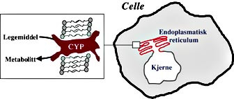 Metabolisme er en av kroppens viktigste forsvarsmekanismer mot eksponering av fremmedstoffer (f.eks. legemidler). Enzymsystemet cytokrom P450 (CYP) fremstår generelt som svært viktig i metabolismen av legemidler. Disse enzymene er hemproteiner, primært lokalisert i endoplasmatisk reticulum (fig 1). Proteinene bidrar til en rødaktig cellefarge (cytokrom) i de vev de uttrykkes i på grunn av maksimal (peak-P) lysabsorpsjon ved bølgelengde 450 nm. Innholdet av CYP er størst i lever og tarm, men enzymene finnes også i andre eksterne barrierer (f.eks. nyrer og lunger). Tidligere ble dette enzymsystemet nærmest betraktet som ett og samme enzym, men det har etter hvert vist seg å bestå av en rekke isoenzymer. Isoenzymene CYP3A4, CYP2D6, CYP2C9 og CYP2C19 ser ut til å være de mest sentrale i metabolismen av legemidler (2). For mange legemidler (primært eldre) er ikke enzymene som er ansvarlig for metabolismen karakterisert. Identifisering av enzymer som er involvert i metabolismen av aktuelle legemidler er imidlertid i dag en vanlig del av den prekliniske utprøvingen, og danner et relativt godt grunnlag for å vurdere potensiell interaksjonsrisiko av ulike medikamentkombinasjoner.