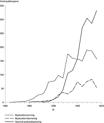 Forskning på regional myokardial blodstrøm, kontraktil funksjon, metabolisme og morfologi har medført oppdagelse av tre nye og viktige fenomener: myokardial stunning, myokardial hibernering og iskemisk prekondisjonering. Disse oppdagelsene har endret tidligere oppfatninger vedrørende myokardial iskemi, som at reperfusjon etter en kort periode med iskemi medfører umiddelbar gjenvinning av kontraktil funksjon, at langvarig iskemi uten reperfusjon uunngåelig vil resultere i nekrose, og at en eller flere korte perioder med iskemi reduserer myokards iskemiske toleranse. Fordi innsikt i de underliggende mekanismer ved stunning, hibernering og/eller iskemisk prekondisjonering kanskje kan danne grunnlag for utvikling av terapeutiske intervensjoner som begrenser uheldige konsekvenser av myokardial iskemi, er det de siste ti år blitt brukt betydelige ressurser på fenomenenes underliggende mekanismer. Denne ressursbruk gjenspeiles i et stort antall publiserte artikler (fig 1). I det følgende vil det bli satt søkelys på fenomenenes forekomst og det terapeutiske potensial, i tillegg vil vår begrensede innsikt i de underliggende mekanismer bli diskutert.
