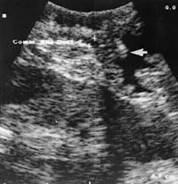 Den intrapankreatiske del av ductus choledochus kan enkelte ganger være vanskelig å fremstille. Denne vanskeligheten kan elimineres ved for eksempel å presse ventrikkelvæske over i duodenum (fig 3), utøve forsiktig kompresjon mot duodenum eller forsøke å skanne denne delen av gallegangen fra lateralsiden av duodenum. En sjelden gang vil det være nødvendig å fjerne CO 2 -gassen fra bukhulen mens undersøkelsen pågår. I vårt materiale lyktes det oss ikke å fremstille denne delen av gallegangen optimalt hos 14 % av pasientene. Dette stemmer godt overens med andre materialer, hvor fremstillingen varierer mellom 87 % og 100 % (17, 18).