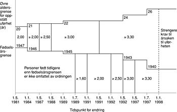 – at ordningen først bare gjaldt personer født i 1947 eller senere. Denne grensen er senere flyttet flere ganger og er nå 1940 eller senere