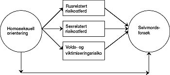 Safren & Heimberg sammenliknet homofile ungdommer i en selvhjelpsgruppe med en tilsvarende kontrollgruppe av heterofile, og fant at deler av, men ikke hele, effekten av seksuell orientering på selvmordsforsøk forsvant ved inklusjon av allmenne risikofaktorer i forklaringsmodellen (14). Det skulle i så fall innebære at det i tillegg til allmenne faktorer er spesielle forhold ved det å være homofil som virker direkte på selvmordsrisikoen, og at homoseksuell orientering er en uavhengig risikofaktor for selvmordsforsøk. I sin modell av sammenhengen mellom seksuell orientering og selvmordsforsøk (fig 1) hevder Garofalo og medarbeidere at vi må regne med at det både er en indirekte og en direkte, uavhengig effekt av seksuell orientering på selvmordsforsøk (9).
