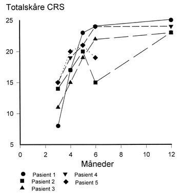 Finset og medarbeidere (11) fulgte hjerneskadede pasienter over tid under rehabilitering og brukte metodene Sunnaas ADL-indeks og en tverrfaglig vurderingsmetode hos pasienter med alle grader av ervervet hjerneskade, inkludert de aller dårligste av pasientene. Disse metodene viste seg å være lite egnet til å vise endringer hos disse pasientene, i motsetning til hos de bedre fungerende. Ifølge våre foreløpige resultater synes aktuelle CRS-metode å være så sensitiv ved store hjerneskader med lavt funksjonsnivå at selv små endringer lar seg registrere på en pålitelig måte.