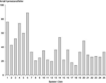 I figur 3 er bydelene kategorisert etter median utrykningstid: £ 4 minutter, 5 – 7 minutter og 8 minutter. Det er en tendens både til kortere utrykningstid og til høyest absolutt antall hjertestanstilfeller i de sentrale bydelene med kortest avstand fra ambulansestasjonen. Disse bydelene (bydel 1, 2, 3, 5 og 6) hadde 301 hjertestanstilfeller (31 %), for en befolkning på ca. 122 000 (24 % av Oslos ca. 500 000 innbyggere).