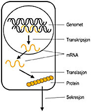 I prinsippet har alle celler i en organisme det samme genmaterialet i sine cellekjerner. Gjennom mekanismer som vi bare delvis forstår, tar en bestemt celle kun deler av genmaterialet i bruk. Hvilke gener som er aktive (uttrykkes) og på hvilket tidspunkt dette skjer, bestemmer hva cellen blir – anatomisk, funksjonelt og på alle andre måter. Skjematisk og svært forenklet kan prosessen med genuttrykk fremstilles som i figur 1. Genet for proteinet kan være aktivert enten i mange/alle celler (for eksempel enzymer nødvendige for grunnleggende cellulær metabolisme), eller kun i spesialiserte celler (for eksempel peptidhormonet insulin i betaceller i pancreas). Hvis det oppstår et behov for økte insulinnivåer, frigjøres lagret hormon samtidig som cellene øker hormonproduksjonen. Dette kan da måles blant annet ved at mengden av hormonets mRNA øker, som følge av at genet blir aktivert. Prosessen der det lages mRNA-kopier av genet kalles transkripsjon, og mRNA-ene kalles transkripter (avskrifter) av genet. Hele samlingen av forskjellige transkripter i en celle eller organisme kalles gjerne transkriptomet.