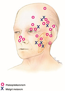For ni pasienter (35 %) ble primærtumor initialt ignorert, og svulsten i glandula parotis ble feilaktig klassifisert som en primærtumor. Utfyllende anamnese og nøye undersøkelse med henblikk på primærtumor og eventuelle arr, samt innhenting av preparat av primærtumor, viste at svulstene i glandula parotis representerte metastaser fra primærtumor med lokalisasjon som vist i figur 1. Seks av primærtumorene var lokalisert i huden i tinningen, seks i kinnet, fem på forsiden av ytre øre, to på øyelokket, to på øyebrynet, en i pannen og en i hodebunnen. Tre av pasientene hadde primærtumor lokalisert i vestibulum nasi eller nesekaviteten. Opplysninger om primærtumors størrelse og infiltrasjonsgrad var i de fleste tilfeller upresise eller utilgjengelige. For alle var tumor i parotiskjertelen første manifestasjon på spredning, og alle var ipsilaterale.