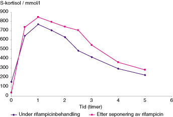 Ved å sammenlikne de to kortisolabsorpsjonstestene som er gjort, finner vi mindre stigning og hurtigere senkning av kortisolnivåene på det tidspunkt pasienten brukte rifampicin sammenholdt med den kurven vi fant uten samtidig bruk av rifampicin (fig 1). Ved hjelp av verdiene for s-kortisol i kortisolabsorpsjonstesten og lineær regresjonsanalyse kunne vi gjøre en grov beregning av halveringstiden for kortisol hos denne pasienten. Kortison hadde en halveringstid uten samtidig rifampicinbehandling på 3,2 timer, mens med samtidig behandling med rifampicin var den på 2,6 timer. Halveringstiden for kortison ble dermed redusert med 20 % da rifampicin ble gitt til pasienten vår. Dette viser en klar interaksjon mellom rifampicin og pasientens kortisolmetabolisme. Ved vurdering av sykehistorien til pasienten i etterkant er det klart at interaksjonen mellom rifampicin og kortison var årsak til at pasientens Addisons sykdom kom ut av kontroll.
