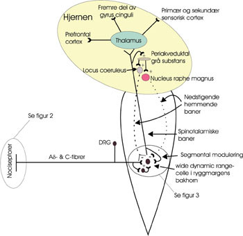 For oversiktens skyld må vi huske at i hud, muskulatur og viscera finner man frie nerveender, fra tynt myeliniserte A δ - og umyeliniserte C-fibrer som kalles nociseptorer. Her kan det genereres aksjonspotensialer ved transduksjon av mekanisk, kjemisk eller termisk energi fra potensielt vevsødeleggende stimuli, slik at nociseptive signaler går fra periferien til ryggmargens bakre horn. Ved dette første relé overføres signalene fra primærafferentene via både mono- og heterosynaptiske forbindelser med 2. ordens smerteceller i bakhornet og videre i kontralaterale parallelle spinale baner til forskjellige supraspinale strukturer (2, 3), hovedsakelig thalamus, men også hypothalamus, amygdala og periakveduktale grå substans og retikulærsubstansen. Nevroner i den periakveduktale grå substans har forbindelser med noradrenerge (bl.a. locus coeruleus) og serotonerge (bl.a. nucleus raphe magnus) kjerner i pons og medulla oblongata. Disse har igjen nedstigende forbindelser til ryggmargens bakhorn og kan modulere nociseptiv informasjon fra periferien til hjernen ved sin virkning direkte på spinale nociseptive projeksjonsnevroner eller via internevroner. Talamiske projeksjonsnevroner sender sine aksoner til forskjellige regioner i hjernebarken inklusive primær og sekundær sensorisk cortex, fremre del av gyrus cinguli og mediale prefrontale cortex (fig 1). Vi har mest kunnskap om hva som skjer i den perifere nerve (fig 2) (4) og ved prosessering av smertesignalene i ryggmargen (fig 3 (5)). Det er derfor disse områdene som vil bli diskutert videre i denne artikkelen.
