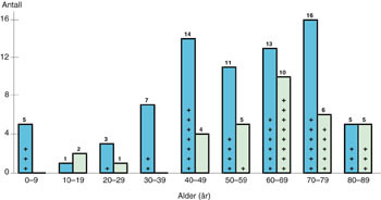 I alt fikk 108 pasienter akutt dialysebehandling, 33 kvinner og 75 menn. 77 pasienter (71 %) fikk kun intermitterende hemodialyse, 11 pasienter (10 %) fikk både kontinuerlig og intermitterende behandling, mens 17 pasienter (16 %) fikk kontinuerlig dialyse som eneste behandlingsmodus. Én pasient fikk kun intermitterende ultrafiltrasjon, og to fikk plasmautskiftning i tillegg til intermitterende hemodialyse. To pasienter fikk peritonealdialyse, begge disse var spedbarn. 89 av 108 pasienter (82 %), 24 kvinner og 49 menn, var hjemmehørende i Hordaland, og dette gir en insidens av sykdomstilstander med akutt dialysebehov på 20,5 per 100 000 innbyggere i vårt fylke. Kjønns- og aldersfordelingen (dekader) av de 108 pasientene fremgår av figur 1.