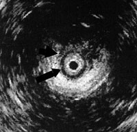 Undersøkelser gjort før og etter operasjonen fremgår av tabell 1. Behandlingsresultatet ble vurdert median 8 måneder (2 – 43 måneder) etter operasjonen. Subjektive plager ble vurdert ut fra kontinens for fast avføring, løs avføring og for luft. Perineums høyde og eventuelle arrforandringer ble vurdert ved inspeksjon. Ved palpasjon ble tykkelsen av og eventuelle defekter i sfinkter vurdert. Sfinktertonus i hvile og under knip ble registrert både ved digital eksplorasjon og ved analmanometri. Transanal ultralydundersøkelse (fig 1) ble utført for å få et visuelt inntrykk av sfinkterskadens lokalisasjon og utbredning.