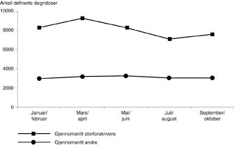 Storforskriverne forskriver større mengde B-preparat hver gang. Storforskriverne kan ha flere konsultasjoner enn de resterende legene og dermed naturlig ha flere pasienter som behandles medikamentelt, blant annet med vanedannende legemidler. Vi har ingen data som sier noe om antall konsultasjoner, men alle tallene som presenteres i figurene 1 – 3 er fra leger som arbeider 19 timer per uke eller mer i kurativ praksis. Vi har heller ingen opplysninger om pasientpopulasjon. Det er også en mulighet at de legene med høyest forskrivning har en annen holdning til medikamentell behandling enn resten av legene, enten det gjelder medikamenter generelt, eller vanedannende legemidler spesielt.
