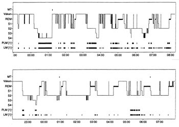 Pasienten startet med antidepressiv medikasjon (nefazodon), lysbehandling og søvnrestriksjon. Etter få uker merket hun klar bedring i humøret, og hun følte at depresjonen forsvant. Søvnen ble også noe bedre. Søvneffektiviteten basert på søvndagbøker steg til 72 – 75 %. Hun fikk detrusitol for blæreproblemene, og vannlatingsplagene ble bedre av dette. Hun følte likevel at søvnen fremdeles var utilfredsstillende, til tross for at hun ikke lenger var deprimert. Basert på mistanken om periodiske beinbevegelser under søvn som mulig årsak til de vedvarende søvnproblemene, ble det utført en polysomnografi. Denne undersøkelsen viste uttalte periodiske beinbevegelser under søvn med en PLM-indeks på 46,0 (fig 1). Den polysomnografiske undersøkelsen viste også en søvneffektivitet på 61 %, og total søvnlengde på litt over 5,5 timer (fig 1). Hun ble samtidig utredet med aktigraf rundt foten som viste periodiske beinbevegelser i 134,0 minutter, tilsvarende 27,1 % av tiden i sengen (fig 2).