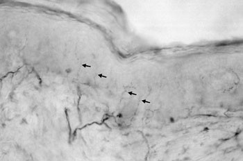 I 1993 beskrev Kennedy & Wendelschafer-Crabb (3) nettverket av nerveender som løper ut til overflaten av huden, ved hjelp av immunhistokjemisk teknikk for påvisning av panaksonalt proteingenprodukt 9.5 (PGP 9.5). Denne metoden tillater kvantifisering av nervefibertetthet i hudbiopsier og gir spesielt mulighet for objektivt å påvise en tilstand som tynnfibernevropati. Epidermale nervefibrer antas i hovedsak å representere C-fibrer og til dels A δ -fibrer (3, 4).