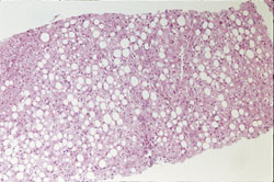 Ved leverbiopsi kan det histologiske bildet ikke skilles fra det man finner ved alkoholisk leverskade; makrovesikulær steatose, nekroinflammasjon, Mallory-legemer, og ulike grader av fibrose, inklusive cirrhose (7).