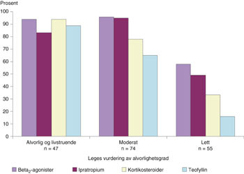Alvorlighetsgraden influerte som forventet på antall legemidler som ble anvendt. Ved livstruende, alvorlig og moderat sykdom fikk nesten alle pasientene beta₂-agonister og ipratropiumbromid. Dette er i samsvar med anbefalingene. Selv om glukokortikoider ble gitt til nærmere 90 % ved de alvorligste og til 75 % ved de moderate formene, er det fortsatt en gruppe pasienter med akutt forverring av obstruktiv lungesykdom som ikke straks får tilleggsdoser av perorale eller intravenøse glukokortikoider. De fleste av disse pasientene hadde en lett alvorlighetsgrad. Vi vet ikke om deres luftveissymptomer kan ha hatt andre årsaker enn kronisk obstruktiv lungesykdom, eller om de fikk behandling av lege eller i ambulanse kort tid før innleggelsen. Forløpet hos disse pasientene i relasjon til de øvrige ble ikke undersøkt og heller ikke hvilken tilleggsbehandling de fikk etter tre timer i sykehus. En nylig publisert amerikansk placebokontrollert multisenterstudie (22) viste at ved forverring av kronisk obstruktiv lungesykdom vil 20 – 60 mg prednisolon i to uker redusere bruk av andre legemidler og forkorte sykehusoppholdet med to dager. Ved astma er det vist at inhalert fluticason ikke kan erstatte glukokortikoider ved akutte alvorlige forverringer (23).