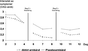Den gjennomsnittlige forskjell mellom de tre siste dagers plager i basisregistreringsperioden (dag 2 – 4) og de tre siste dager i intervensjonsperioden (dag 6 – 8) er presentert i tabell 2. Varigheten av plager var kortere i den aktivt behandlede gruppen enn i placebogruppen, reduksjonen var henholdsvis 2,74 timer og 0,85 timer (p = 0,018). Kvinnene i den aktivt behandlede gruppen rapporterte også en større grad av bedring ifølge VAS, men ikke signifikant på 5 %-nivå.