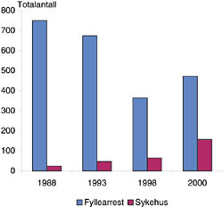 Figur 1 viser utviklingen i antall personer som er blitt innbrakt til fyllearrest eller innlagt i sykehus i løpet av undersøkelsesperioden. Antall i fyllearrest ble mer enn halvert fra 1988 til 1998, men har deretter økt i år 2000. Samlet har det vært en 40 % reduksjon i bruk av fyllearrest fra 1988 til år 2000. Antall sykehusinnleggelser forårsaket av alkoholforgiftning ble mer enn seksdoblet fra 1988 og frem til år 2000.