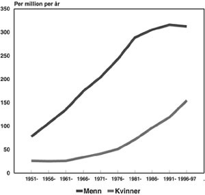 Dødelighetskurven for menn har nå flatet ut og er muligens på vei nedover (fig 1). For kvinner er kurven sterkt oppadgående. I 1996 – 97 var dødeligheten for kvinner på samme nivå som den var for menn 30 år tidligere. Mens dødeligheten for menn har stanset opp, var det for kvinner en økning på 30 % fra 1991 – 95 til 1996 – 97.