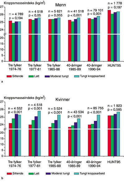 For å sammenlikne kroppsmasseindeks etter kroppsarbeid er variansanalyse blitt brukt (SPSS 9.0 for Windows). For sammenlikning av grupper undersøkt på ulike tidspunkter fra 1974 – 76 frem til 1995 – 97 har vi benyttet aldersgruppen 40 – 42 år i alle materialene. Justering er gjort for dagligrøyking og for mosjon i fritiden. Når det gjelder HUNT95 betyr ”hard mosjon i fritiden” at det er rapportert regelmessig mosjon i gjennomsnitt minst en gang i uken, intenst nok til å fremkalle svette eller andpustenhet. I hjerte- og karundersøkelsene 1974 – 88 og 40-åringsundersøkelsene 1985 – 94 ble et helt annet spørsmål brukt. Her betyr ”mosjon” at det er oppgitt lett, moderat eller tyngre mosjon av minst fire timers varighet per uke.
