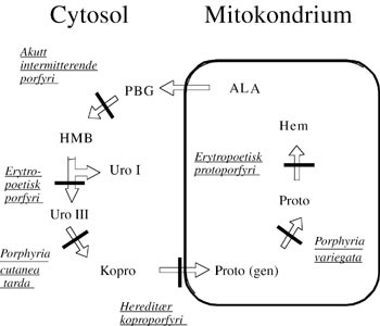 Porfyrier er en relativt sjelden gruppe sykdommer som skyldes arvelige defekter i enzymer som er involvert i hemdanningen (fig 1). De deles gjerne i erytropoetiske og hepatiske alt etter i hvilket organ man mener enzymdefekten finnes og hvor denne blir hastighetsbegrensende for danningen av hem. Den hyppigst forekommende porfyri i Norge er akutt intermitterende porfyri som tidligere er omtalt i Tidsskriftet (1). Den arves autosomalt dominant. Porfyria variegata er betydelig sjeldnere enn akutt intermitterende porfyri. Det første tilfellet i Norge ble beskrevet i 1990 (2). Disse to porfyriene og hereditær koproporfyri (ikke påvist i Norge) har ofte ”akutte” symptomer i form av anfall med smerter, hyppigst i abdomen, men også i ryggen og ekstremitetene. Pasientene kan også få pareser og psykiatriske symptomer. Symptomene kan likne på en rekke andre tilstander og sykdommene blir ofte kalt for den ”lille imitator”, i motsetning til den ”store imitator” – syfilis.
