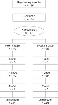 De 61 pasienter som var villig til å delta i studien ble først testet, deretter stratifisert og blokkrandomisert i to grupper ut fra kjønn og hemisfæreutfall (fig 2). Det ble ingen signifikant forskjell mellom gruppene i alder eller sivilstand. Studien var i prinsippet dobbeltblind, noe som selvsagt var vanskelig å kontrollere i praksis. Koden ble først brutt etter avsluttet testing tre måneder etter at siste pasient ble utskrevet. Hvilken type behandling pasienten fikk, var bare kjent for sekretæren ved avdelingen, som hadde ansvar for randomiseringen, og for behandlende fysioterapeut.