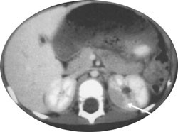 Ved neste konsultasjon var CRP 310 mg/l og pasienten var høyfebril. Abdomen var bløt og uøm, uten bankeømhet over nyrelosjer. Urinstiks var negativ. Mikroskopisk undersøkelse av urinen var gjentatte ganger normal. Ingen vekst av bakterier i blodkultur. Til tross for usikker infeksjonsfokus ble det gitt antibiotika intravenøst i form av cefotaksim. I den videre utredningen ble det gjort CT-undersøkelse av abdomen, som viste fokale forandringer i venstre nyre og en liten, skrumpet høyre nyre (fig 2).