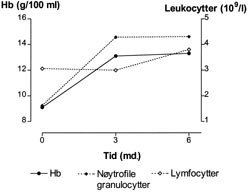En måned etter utskrivning kom pasienten til poliklinisk kontroll. Han hadde merket tydelig bedring i sin fysiske yteevne. Da han viste tegn til å få for mye kortisol (rund og rødmusset i fjeset), ble Cortone redusert til 25 mg + 12,5 mg. Han begynte også med gradvis nedtrapping av tyroksin. Etter tre måneder ble det foretatt kontroll av blodprøver og beinmarg. Han hadde gått opp 6 – 7 kg i vekt og var blitt rund i kinnene. Allmenntilstanden var svært god, han drev daglig fysisk aktivitet og hadde til dels anstrengende arbeid. Plagene med kalde fingrer var helt forsvunnet. Hb hadde steget til 13,1 g/100 ml, og det forelå ingen absolutt nøytropeni eller relativ lymfocytose (fig 1). Perifert blodutstryk var normalt. Beinmargsutstryket hadde normalisert seg og viste ikke lenger venstreforskjøvet myelopoese eller dysplastiske trekk (fig 2b). Beinmargsbiopsien (fig 3b) ble vurdert å ha normal cellefordeling og normal cellularitet (45 – 50 %).