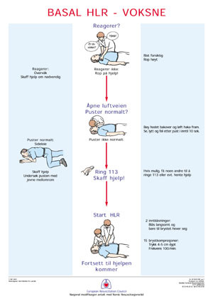 4) Start hjerte-lunge-redning og fortsett til hjelpen kommer. Norsk Resuscitasjonsråd har foretatt en nasjonal forenkling ved å fjerne anbefalingen om først å ”gi to effektive innblåsninger” fordi hjerte-lunge-redning allikevel starter med to innblåsninger.