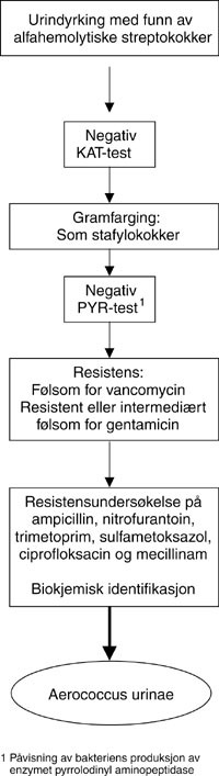 For å unngå overdiagnostisering av A urinae, er det nødvendig å utføre biokjemisk identifikasjon. Det er flere streptokokker i viridansgruppen med resistensmønster identisk med det man finner for A urinae. Vi anbefaler bruk av flytskjema, som vist i figur 1. American Society for Microbiology anbefaler også utsæd på medium anriket med 6,5 % NaCl for å skille mellom A urinae og Stomatococcus, en mikrobe som tilhører normalflora i munnslimhinnen. Vi anser dette som unødvendig ved urin som prøvemateriale.