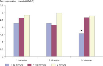 Ifølge vår definisjon på fysisk aktivitet (60 min/uke), var 70 % av de gravide fysisk aktive minst to av tre trimestre (tab 2). Henholdsvis 72 %, 67 % og 51 % var aktive i første, andre og tredje trimester, uavhengig av intensitet. Det var færre av kvinnene selv som definerte seg som fysisk aktive enn den andelen som innfridde kriteriene via vår definisjon. Andelen av kvinner som selv definerte seg som aktive og som via vår definisjon ( 60 min/uke) ble klassifisert som aktive, er gjengitt i tabell 2. 42 %, 36 % og 16 % var fysisk aktive med moderat intensitet i henholdsvis første, andre og tredje trimester. I første trimester innfridde 41 % av de gravide anbefalingene til Statens råd for ernæring og fysisk aktivitet når det gjelder fysisk aktivitet ( 30 min/dag). Denne andelen ble redusert til 36 % og 20 % i henholdsvis andre og tredje trimester. Ved en sammenlikning av kvinner med og uten barn fra før var det ingen forskjell i andelen som var fysisk aktive i svangerskapet. Etter som svangerskapet skred frem, var det en reduksjon i mengde aktivitet og et skifte i type aktiviteter. De hyppigste aktivitetene rapportert under hele svangerskapet var turgåing, ulike former for aerobic, svømming og rask gange. Andelen av kvinner som hadde en skåre på HADs depresjonstest som var lik eller høyere enn 8 i henholdsvis svangerskap og barsel var 5,6 % (n = 11/196) og 5,3 % (n = 9/171).