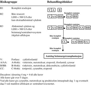 Pasientene fikk BFM-basert kjemoterapi som primærbehandling eller ved svikt ved annen kjemoterapi i henhold til ulike BFM-protokoller; BFM-81, -83, -90 (4, 5, 7 – 10). Hovedmodifikasjonen ved BFM-90 sammenliknet med tidligere protokoller er stratifisering av behandlingsvarighet etter laktatdehydrogenaseverdi før behandlingsstart og at flere pasienter får høydosebehandling med metotreksat. BFM-protokollen for voksne pasienter med B-ALL har en aldersjustering av høydose metotreksat-dosen (German Adult ALL 05/93-protokoll). Pasientene ble stratifisert til terapiarm og risikogruppe i henhold til protokoll (5, 6, 8, 9) (fig 1). Pasienter med perifert T-cellelymfom ble behandlet i henhold til BFM-terapiarm for storcellede anaplastiske lymfomer (11).