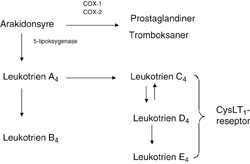 I 1998 kom en ny type antiastmatisk medikasjon, leukotrienantagonisten Singulair med det generiske navnet montelukast, på markedet i Norge. Internasjonalt finnes også leukotrienantagonistene zafirlukast og pranlukast. De tre preparatene virker alle ved å blokkere cysteinylleukotrienreseptor 1 (fig 1), og hemmer dermed effekten av cysteinylleukotrienene C4, D4 og E4. Cysteinylleukotrienene er svært potente substanser (tidligere kalt ”slow reacting substance A”), som bl.a. gir økt kapillær permeabilitet i bronkier og stimulerer til mucussekresjon. De er de mest potente bronkokonstriktorer som til nå er kjent, ca. tusen ganger mer potente enn histamin (1, 2). Rent teoretisk ville man forvente en sterk antiastmatisk effekt ved blokkering av disse cysteinylleukotrienene, men den kliniske erfaringen er at effekten av montelukast er mer moderat og individuelt varierende.