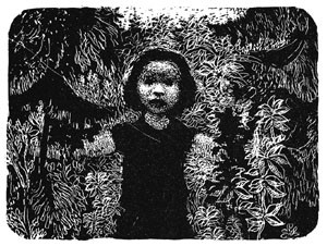 Laget en annen tegn., ett alternativ, denne i rent sort-hvitt – og lett å trykke, en liten pike mellom trær, vill i skogen.