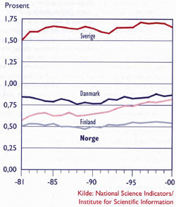 Blant de nordiske landene er Sverige den ledende kunnskapsnasjonen, med 1,7 % av verdens artikkelproduksjon (fig 1). Dette er dobbelt så mye som Danmark. Finland, som har hatt den kraftigste veksten i vitenskapelig produksjon de siste årene, begynner nå å måle krefter med Danmark. Til sammen sørger de nordiske landene, Norge inkludert, for ca. 4 % av verdens vitenskapelige artikler.