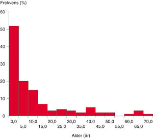 Inkludert i denne retrospektive studien er alle pasienter behandlet med endoskopisk tredjeventrikkelstomi. Det ble i denne perioden foretatt 136 prosedyrer på 120 pasienter, 60 jenter/kvinner og 60 gutter/menn. 14 pasienter gjennomgikk to prosedyrer og en pasient tre. Gjennomsnittsalder var 11,7 år (spredning 0,0 til 71,7 år); median alder var 3,3 år. Figur 1 viser aldersfordelingen, og tabell 1 viser årsaken til hydrocephalus. Da endoskopisk tredjeventrikkelstomi var en ny teknikk som ikke alle vakthavende nevrokirurger var fortrolig med, og indikasjonene for metoden ikke var entydige, har det vært noe varierende i perioden om pasientene med vannhode ble behandlet med den nye teknikken eller med innleggelse av shunt/shuntrevisjon. I perioden ble det utført totalt 479 shuntprosedyrer (inklusive shuntprosedyrer på studiepasientene), hvorav 186 var førstegangsshunter og 293 var shuntrevisjoner (tab 2).