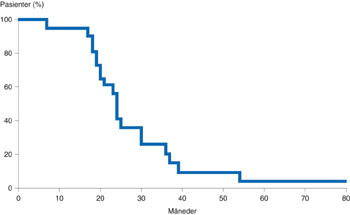 20 av de 21 pasientene (95 %) som nådde komplett remisjon, fikk påvist residiv ved væskestrømscytometri i løpet av observasjonstiden (fig 1). Mediantiden fra komplett remisjon til påvist residiv var 1,3 år (0,5 – 4 år). En pasient var fortsatt i komplett remisjon etter 6,2 års observasjon. Oppfølging med beinmargsundersøkelser ble da avsluttet etter pasientens ønske. Pasienten er fortsatt i remisjon, etter konvensjonelle kriterier, sju år etter behandling med cladribin.