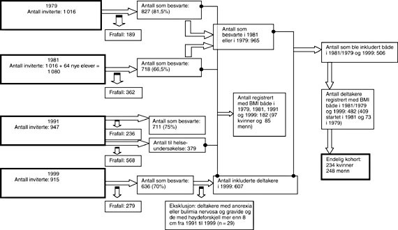 Antall inviterte og deltakerprosent i undersøkelsen er beskrevet i figur 1. I 1979 ble det invitert 1 016 elever, hvorav 827 deltok. I 1981 ble igjen alle elever på 7., 8. og 9. klassetrinn ved de seks skolene invitert. Grunnet nye elever ved skolene ble det invitert 1 080 elever i 1981 (de 1 016 fra 1979 samt 64 nye). Disse dannet grunnlaget for mulig deltakelse videre i undersøkelsen. Av de 636 deltakerne i 1999 ble 29 ekskludert på grunn av at høydeforskjellen mellom 1991 og 1999 var mer enn 8 cm (n = 3), at de hadde oppgitt å ha anorexia (n = 1) eller bulimia nervosa (n = 3) eller å være gravide (n = 22). Beskrivelse av de resterende 607 finnes i tabell 1.