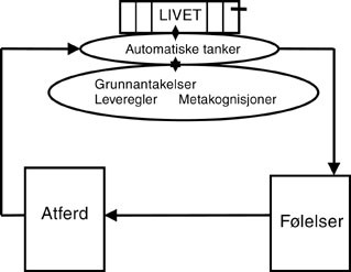 Med metakognisjoner menes ”tanker om tanker”, dvs. hvilken holdning man har til det fenomenet som er aktuelt (døden, subjektive symptomer, angst, sinne osv.). Pasientene er ofte ikke klar over hvilke holdninger de faktisk har, og kan bli svært forbauset når dette avdekkes. Forholdet mellom tanker, følelser og atferd er komplisert, og pilene som er anført i figuren, kan gå begge veier. Pasienten blir ved å studere figuren bevisstgjort på at det er forskjell på tanker og følelser. Det er vanligvis en logisk og nær sammenheng mellom tankene og følelsene. Tenker man ”dette er urettferdig” blir man sint, ”dette er farlig” fører til angst, ”jeg gjør alltid feil” ledsages av tristhet eller nedstemthet osv. Følelsene (sinne, angst, nedstemthet, glede, forvirring, skam, avsky, sjalusi, overraskelse) kan blandes, slik at man ikke nødvendigvis kun opplever e…n tanke og følelse om gangen.